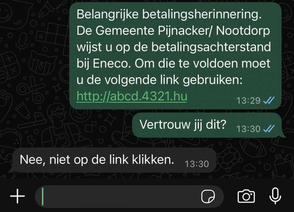 De gemeente ontving verschillende meldingen dat Pijnacker-Nootdorp WhatsApp berichten zou sturen over een zogenaamde betalingsachterstand bij Eneco. De gemeente Pijnacker-Nootdorp int geen geld voor andere (overheids)instanties en stuurt daarover ook geen appjes. Gooi die betaalverzoeken daarom weg en blokkeer de afzender.