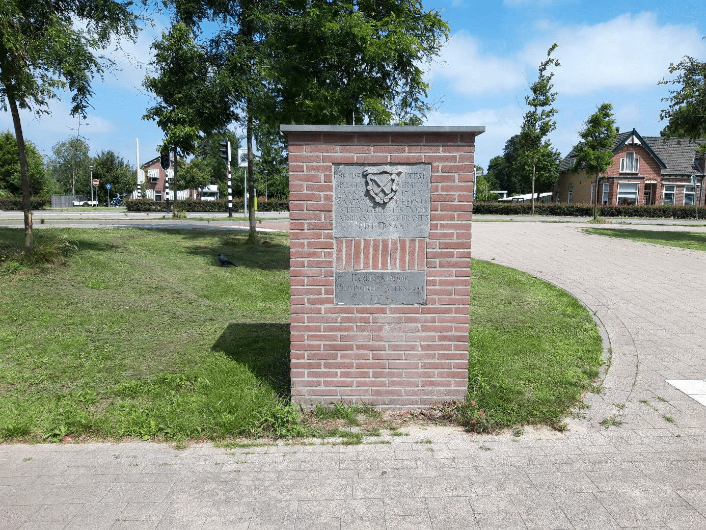 Hardstenen gedenksteen met het wapen van Pijnacker en de tekst: ‘BEYDE DEESE BRUGGENS VERNIEUWD ANNO 1747. WAARVAN DE EERSTE STEEN GELEGT IS DOOR ADRIANUS POST BRANTS OUT 11 YAAR.’ Adrianus Post Brants was de zoon van de toenmalige schout van Pijnacker. De steen werd in 1974 herplaatst, waarbij een hardstenen gedenksteen werd aangebracht met de tekst: ‘HERLEGD DOOR PROVINCIALE WATERSTAAT 1974.’